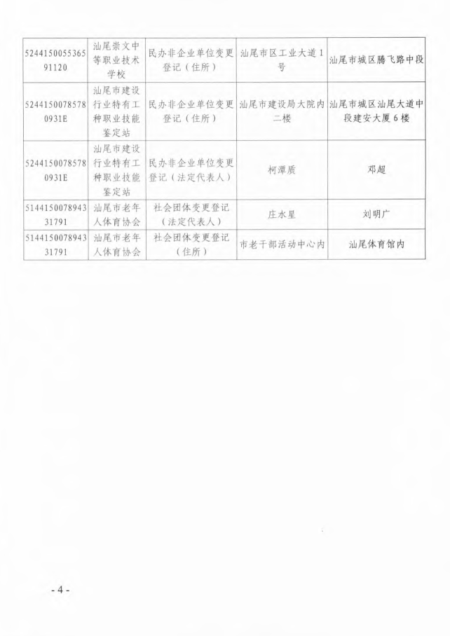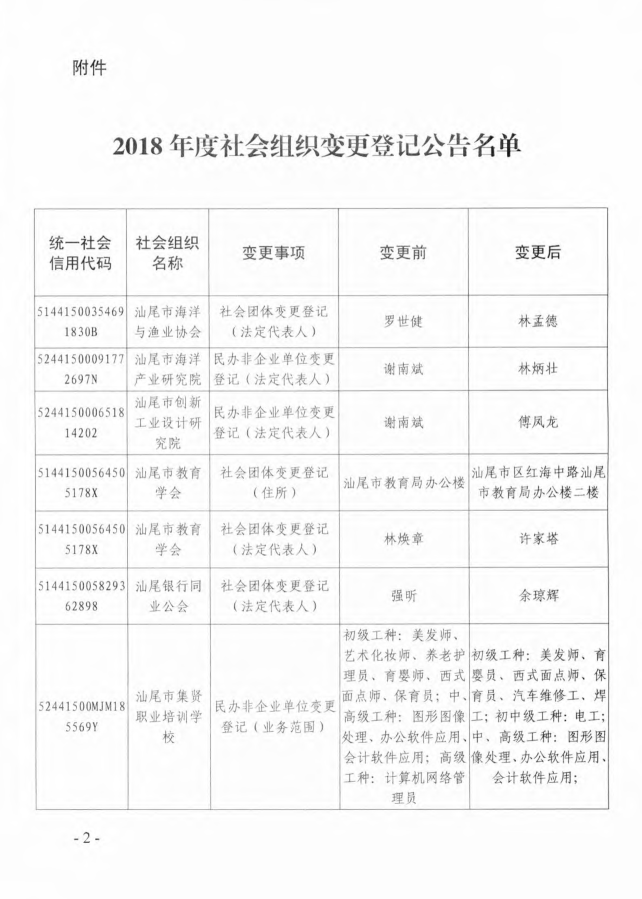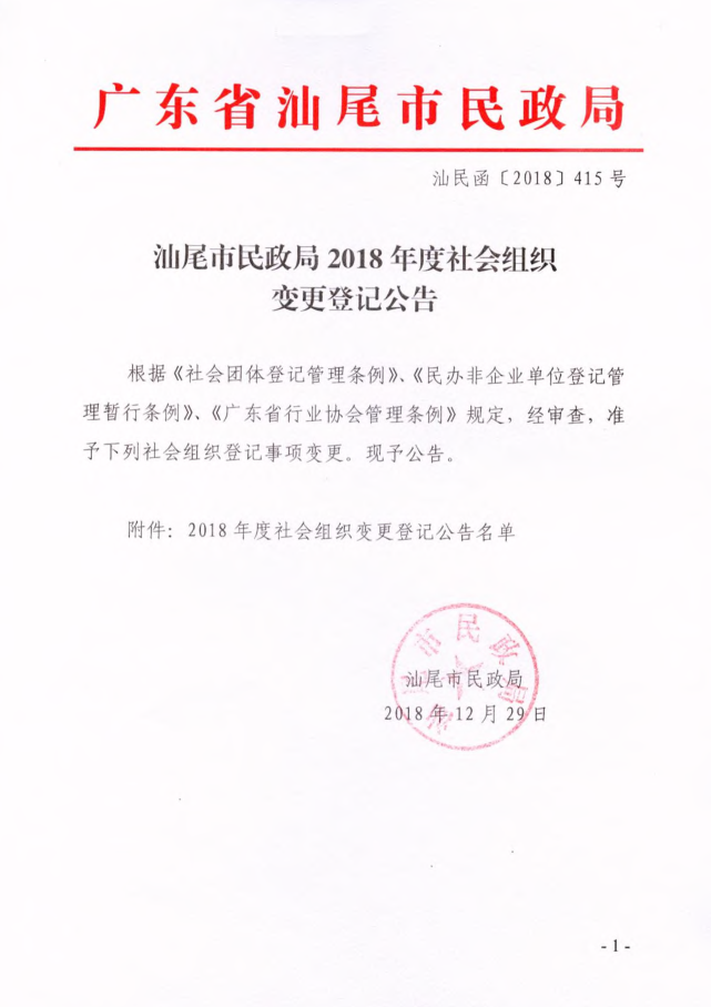 汕尾市民政局2018年度社会组织变更登记公告