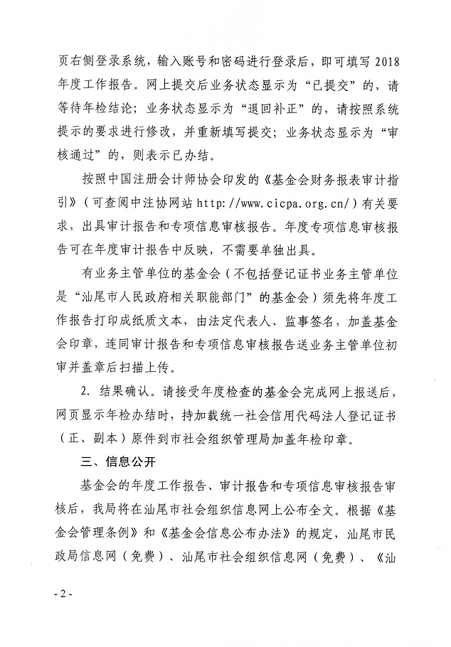 汕尾市民政局关于开展市级基金会2018年度报告和年度检查工作的通知