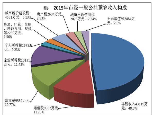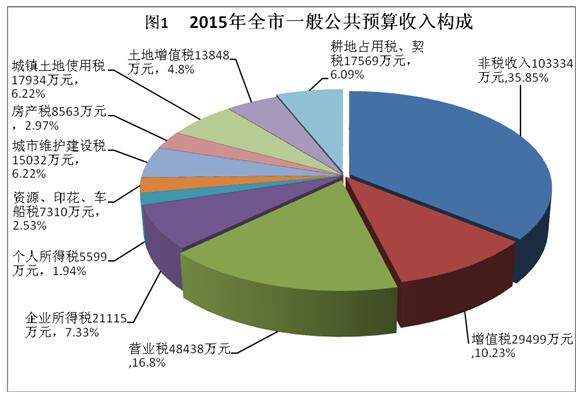 1.全市一般公共预算执行情况。2015年全市一般公共预算收入完成288241万元,完成调整预算的102.17%,比上年减收203892万元,下降41.43%。剔除以前年度虚增收入退库调整因素,实现0.21%微幅增长。其中:国税部门完成税收收入43473万元,比上年减收7673万元,下降15%;地税部门完成税收收入141434万元,比上年减收38453万元,下降21.38%;财政部门完成非税收入103334万元,比上年减收157766万元,下降60.42%。