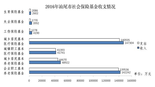 2016年全市社会保险基金支出371668万元,完成年度预算的101%,比上年增支48571万元,增长15%。其中:企业职工基本养老保险基金支出139536万元,完成年度预算的101%,比上年增支15335万元,增长12%。城乡居民基本养老保险基金支出44670万元,完成年度预算的95%,比上年增支5019万元,增长13%。城镇职工基本医疗保险基金支出41393万元,完成年度预算的99%,比上年增支4171万元,增长11%。城乡居民基本医疗保险基金支出140935万元,完成年度预算的103%,比上年增支21781万元,增长18%。工伤保险基金支出1278万元,完成年度预算的158%,比上年增支412万元,增长48%。失业保险基金支出1770万元,完成年度预算的138%,比上年增支523万元,增长42%。生育保险基金支出2086万元,完成年度预算的186%,比上年增支1330万元,增长176%。