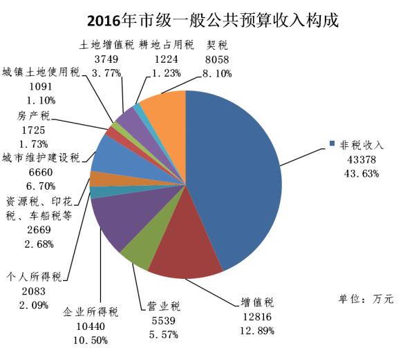 2.市级一般公共预算执行情况。2016年市级(不包括市城区、红海湾开发区和华侨管理区)一般公共预算收入完成99432万元,完成年度预算的100.06%,比上年同期增收14175万元,增长16.63%。分征管部门情况看,国税部门完成税收收入21835万元,比上年同期减收1131万元,下降4.92%;地税部门完成税收收入34219万元,比上年同期增收15156万元,增长79.5%;财政部门完成非税收入43378万元,比上年同期增收150万元,增长0.35%。