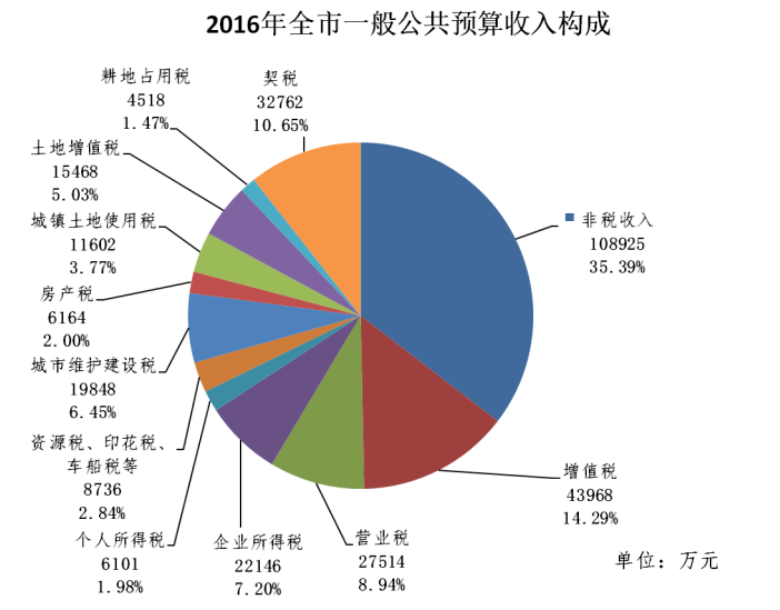 1.全市一般公共预算执行情况。2016年全市一般公共预算收入完成307752万元(快报统计数,下同),完成调整预算的101.91%,比上年同期增收37326万元,增长13.8%(按可比口径,下同)。分征管部门情况看,国税部门完成税收收入56530万元,比上年同期减收4899万元,下降7.98%;地税部门完成税收收入142297万元,比上年同期增收36910万元,增长35.02%;财政部门完成非税收入108925万元,比上年同期增收5315万元,增长5.13%。