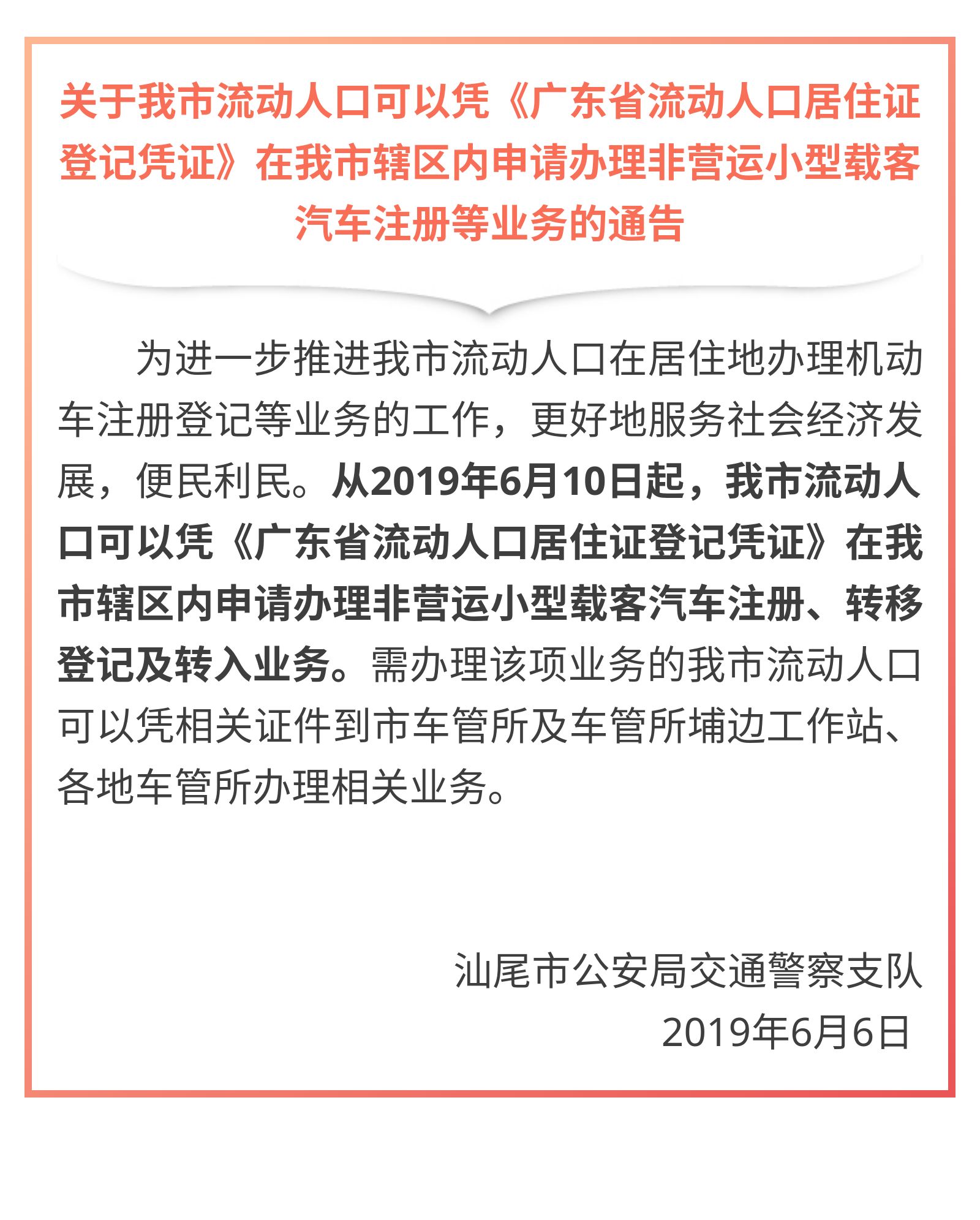 汕尾流动人口今起可办理这项车管业务