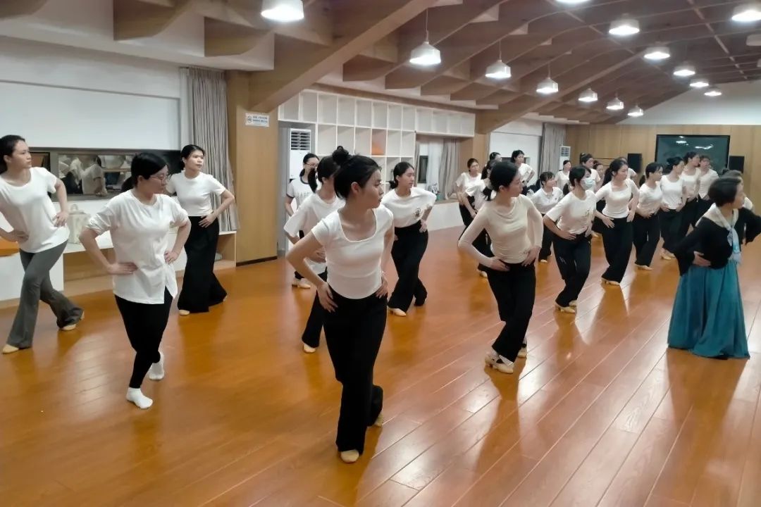 市馆本部舞蹈教室里舞姿翩翩、活力四射。舞蹈老师手把手指导学生,细致讲解舞蹈的动作技巧,通过舞蹈动作来展现民族风情。