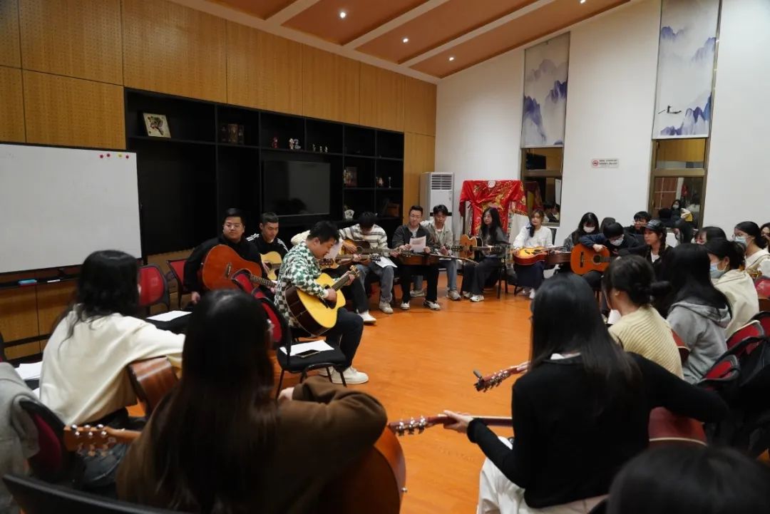 市馆本部吉他培训班上的氛围热烈而专注。青年学员们手持吉他,认真地听老师讲解吉他的弹奏技巧,优美的旋律随之响起,整个课堂充满了青春与活力。