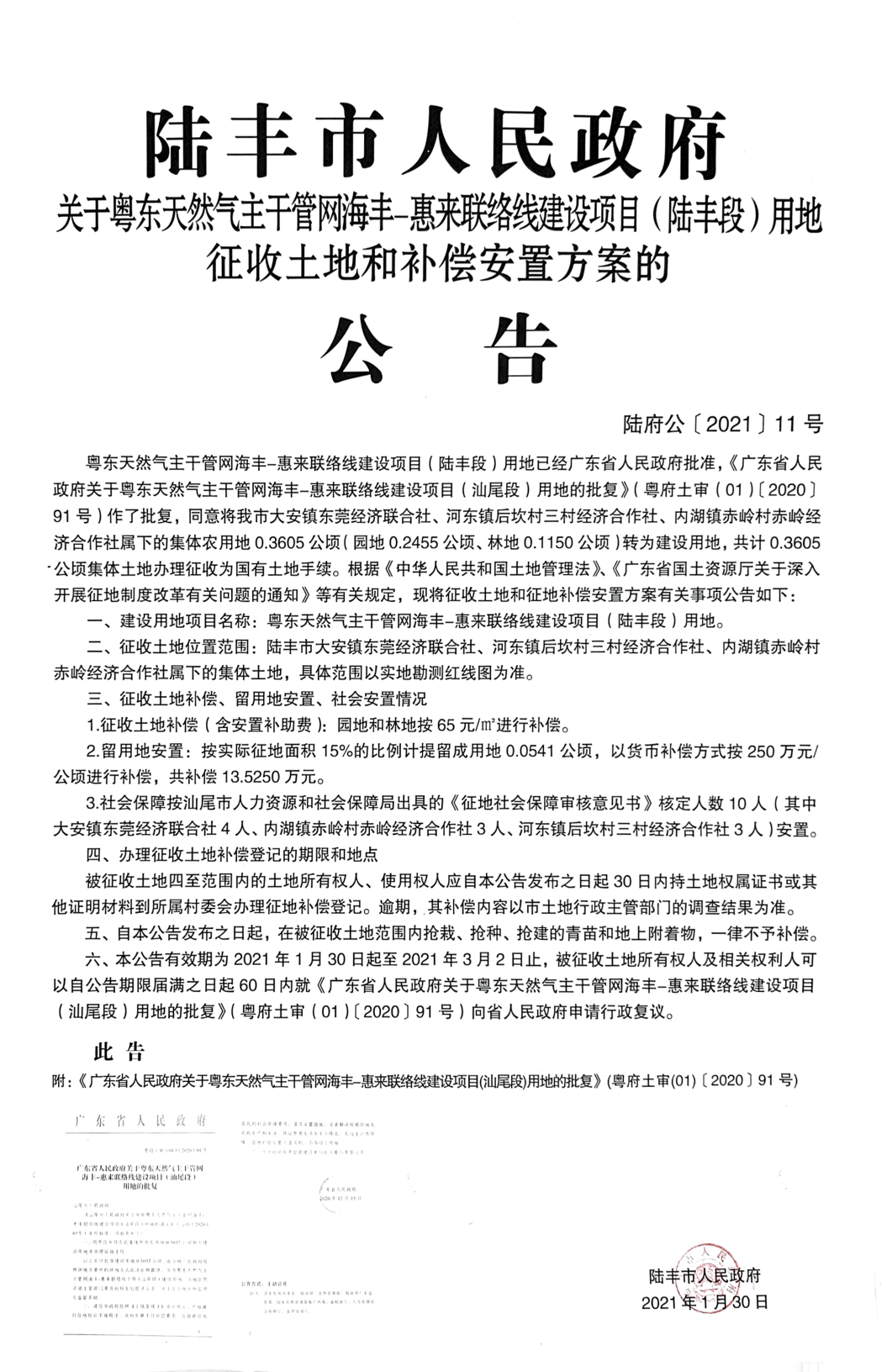 陆丰市人民政府关于粤东天然气主干管网海丰-惠来联络线建设项目(陆丰段)用地征收土地和补偿安置方案的公告(陆府公[2021]11号)