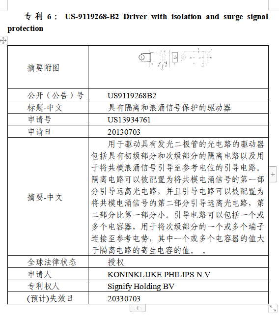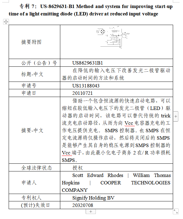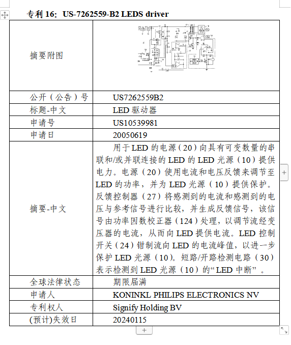 涉案专利共20件,涉及LED驱动电路、光学元件、系统架构等,专利信息详见下表。值得注意的是,在20件涉案专利中,有7件专利在Signify和Current的诉讼中均有涉及,11件专利由Current提起不侵权宣告而并未被Signify作为专利侵权诉讼基础,2件专利Signify作为专利侵权诉讼基础但Current未提起不侵权宣告。