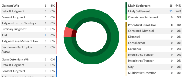 其中,1起原告胜诉,0起被告胜诉,其余15起均为和解结案(占结案案件的94%)。