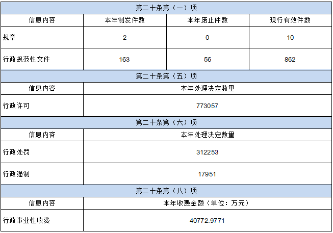 (一)主动公开方面。规范发布政府信息法定主动公开内容,深化“五公开”和重点领域政府信息公开,加强财政预决算和“三公”经费、住房保障、环境保护、征地信息、安全生产等领域政府信息公开力度。2024年全市行政许可、行政处罚、行政强制决定数量分别为773057宗、312253宗和17951宗,行政事业性收费总金额4.0773亿元。
