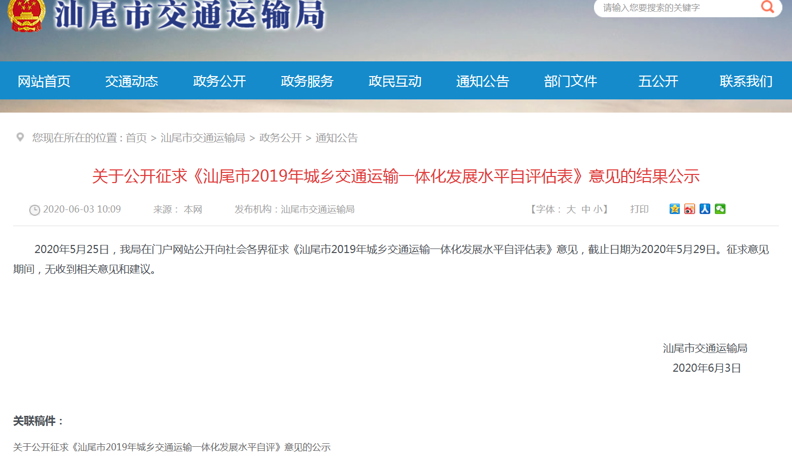 4.关于公开征求《汕尾市2019年城乡交通运输一体化发展水平自评估表》意见的结果公示.png