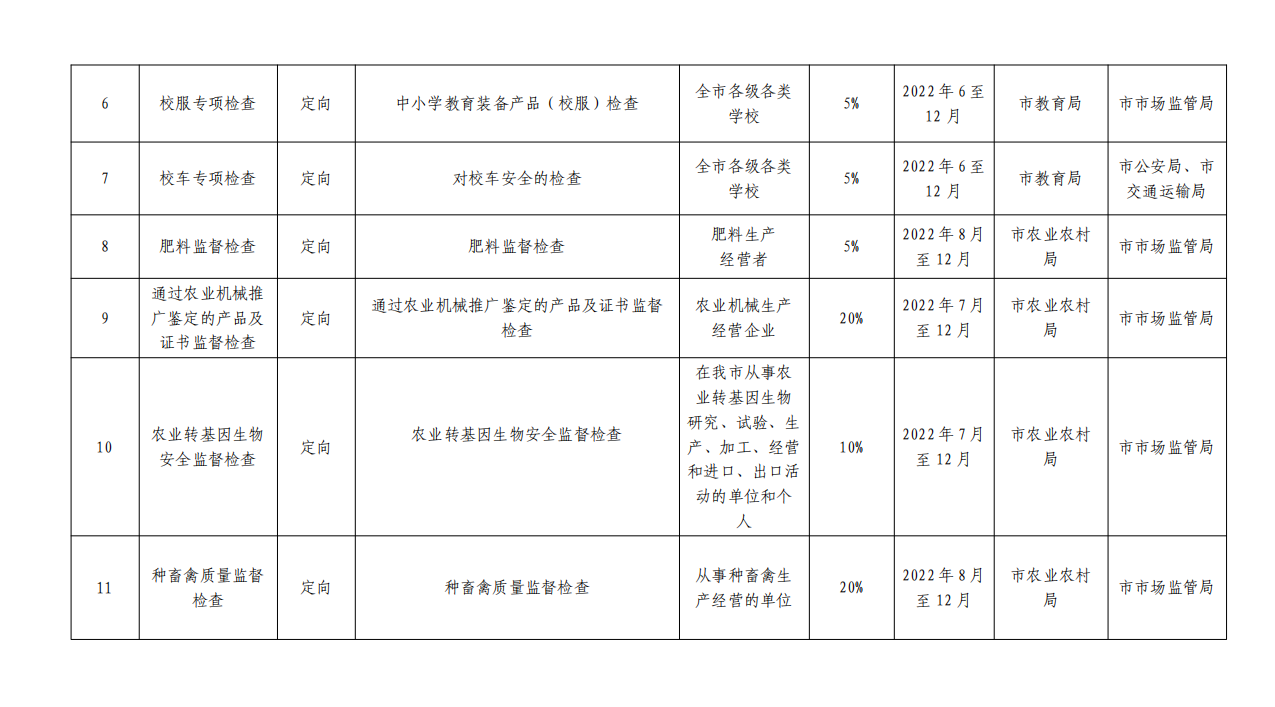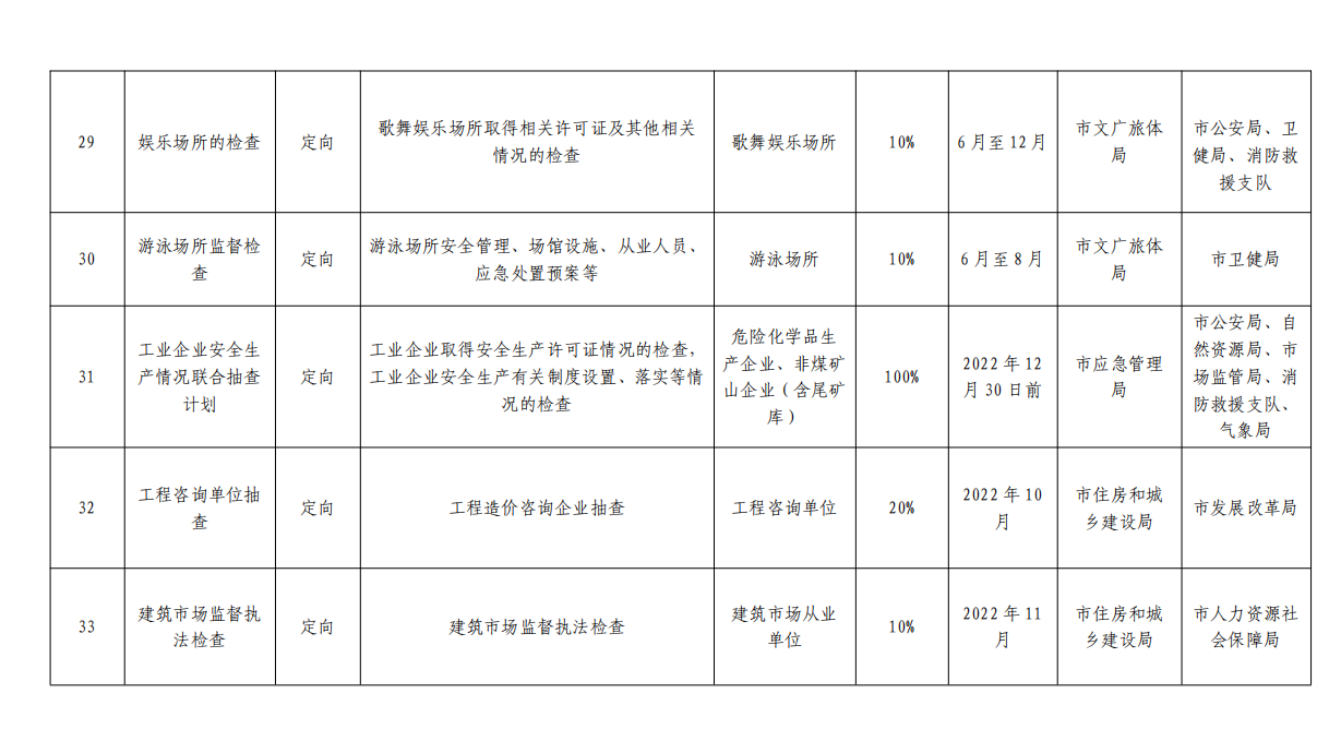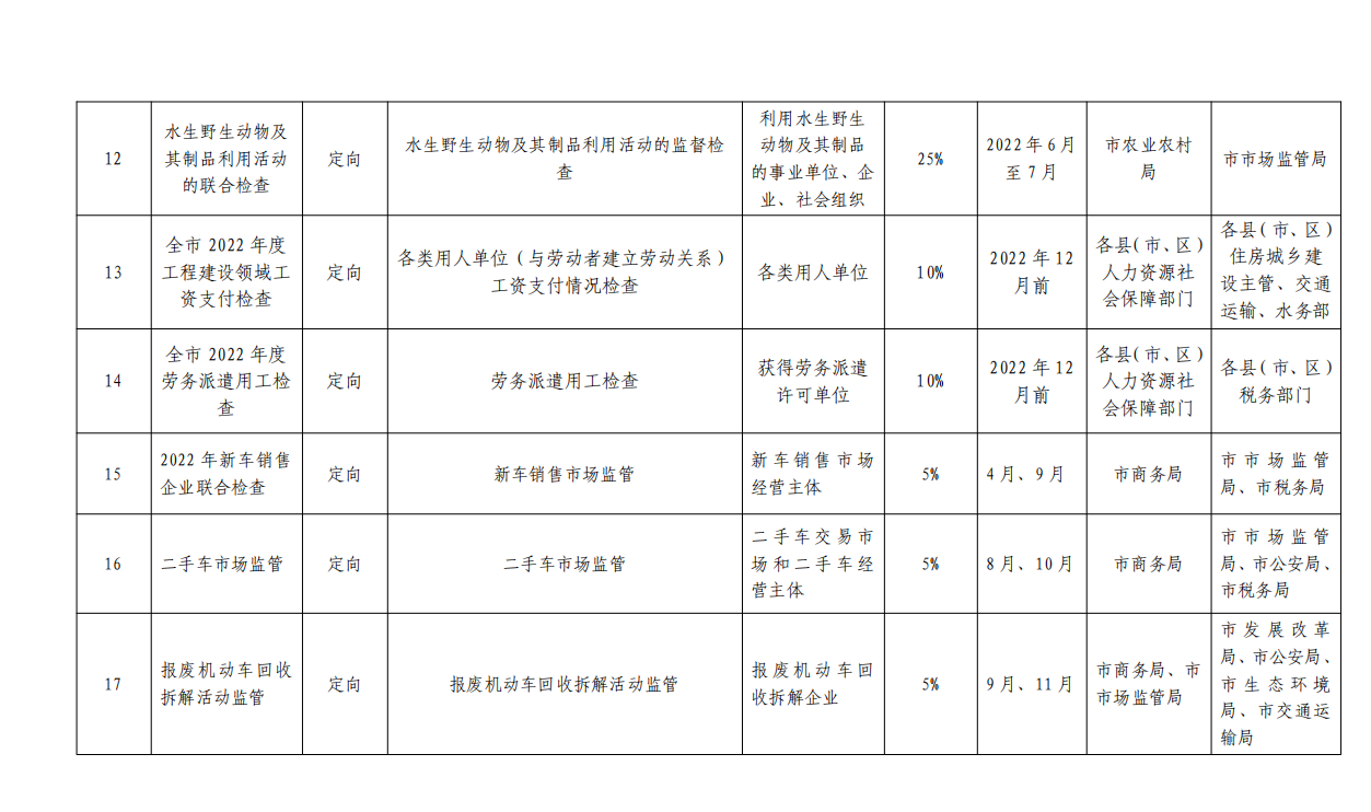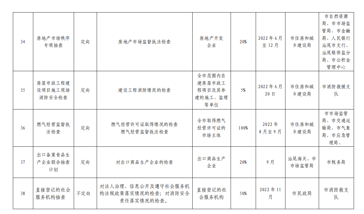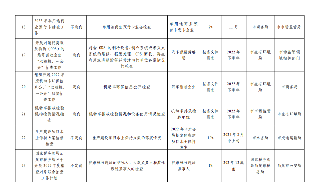 根据 2022 年市《政府工作报告》及汕尾市 2022 年全面优 化营商环境攻坚行动方案的部署,制定了《汕尾市 2022 年度 市场监管领域部门联合双随机抽查工作计划》,请各成员单位 按照计划认真组织开展部门“双随机”联合抽查工作;各县(市、 区)要参照市的做法制定本地区的部门联合抽查计划并组织实 施。要强化信用基础性作用,开展差异化监管。推进企业信用 风险分类管理,构建以信用为基础的新型监管机制,进一步提 升“双随机、一公开”监管效能,在“双随机”监管过程中合 理确定、动态调整抽查比例和频次,对信用风险高的主体增加 检查频次,并制定抽查计划加强监管。实现企业信用风险分类 结果在“双随机”监管中常态化运用。