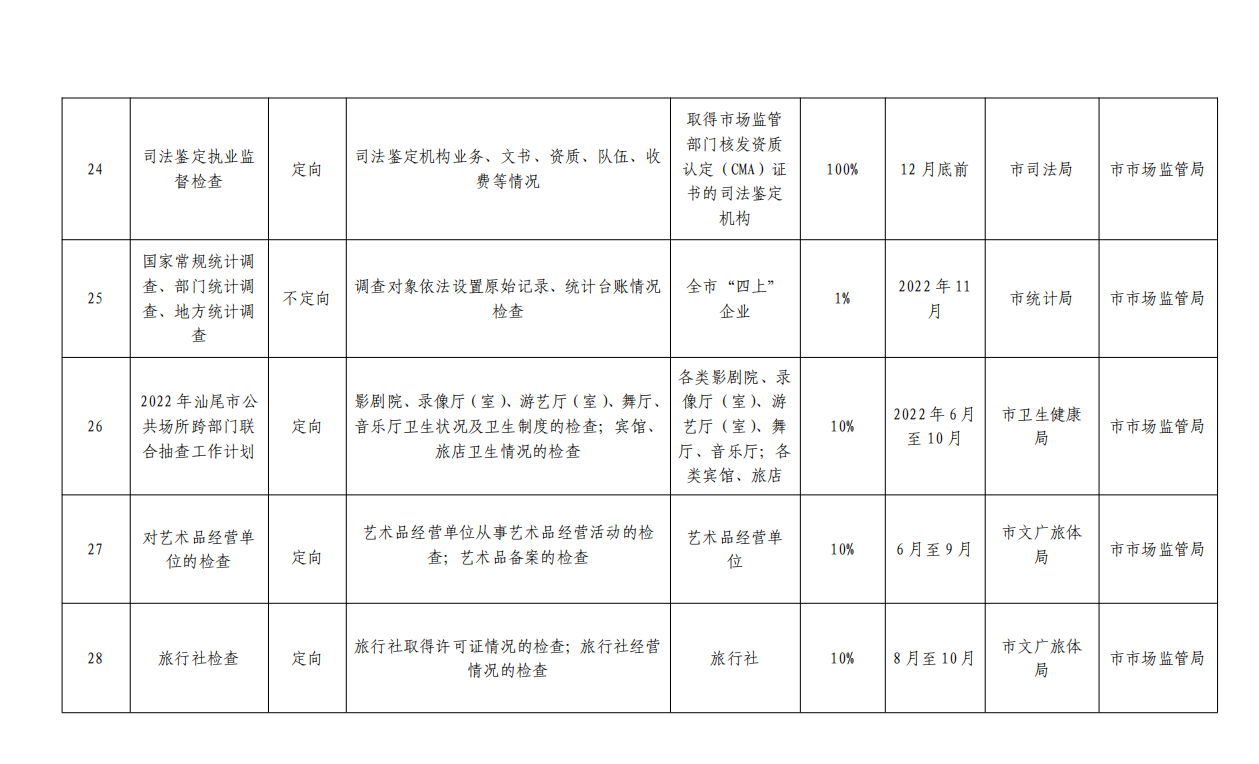 附件:汕尾市 2022 年度市场监管领域部门联合双随机抽 查工作计划