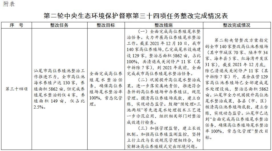按照《广东省中央生态环境保护督察整改任务验收销号工作指引(试行)》要求,第二轮中央生态环境保护督察第三十四项任务已完成整改,具备验收销号条件。现将第三十四项任务整改完成情况予以公示,如对上述公示情况有异议,请在公示期间(2025年6月18日—2025年7月1日)向本单位反映。