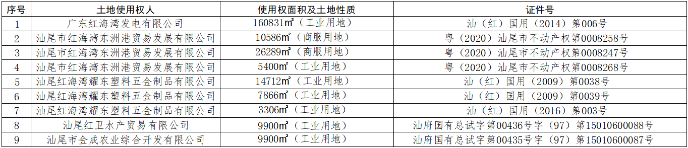 拟有偿收回广东红海湾发电有限公司国有建设用地使用权一宗、汕尾市红海湾东洲港贸易发展有限公司国有建设用地使用权三宗、汕尾红海湾耀东塑料五金制品有限公司国有建设用地使用权三宗、汕尾红卫水产贸易有限公司国有建设用地使用权一宗、汕尾市金成农业综合开发有限公司国有建设用地使用权一宗,详见下表。