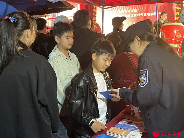 “院前芳枝挂半空,猜打击走私相关名词”“谜底就在宣传手册里,大家可以翻翻看”……在活动宣传摊位上,民警通过张贴海报、发放宣传资料等方式,向群众普及反走私反偷渡、防范电信诈骗、禁毒等相关法律法规,而张贴在舞台上的谜笺围绕主题,巧妙融入相关知识,吸引了许多群众驻足参与。此次活动以“接地气”的方式筑牢群众防范意识,让“全民共建平安汕尾”理念与团圆喜气共融。