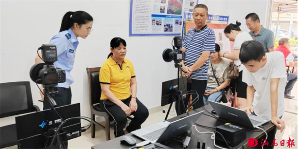 图为现场工作人员为换证居民进行照片采集。