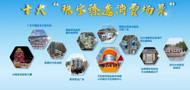 十大“珠宝臻选消费场景”:天虹数科商业股份有限公司海丰天虹购物中心、广东可塘珠宝交易市场、御景时代珠宝城、荔塆珠宝广场、梅陇珠宝首饰国际商贸城、梅陇东怡珠宝首饰交易广场、汕尾珠宝保税大厦、长沙湾服务区鱼尾厅珠宝展销区、汕尾高铁站珠宝文化销售展示厅、浮日计划系列咖啡店。
