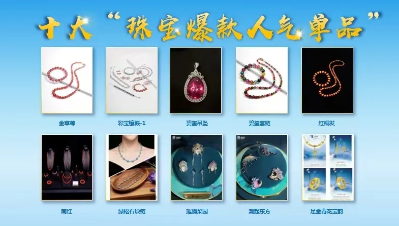 十大“珠宝爆款人气单品”:金草莓、彩宝镶嵌—1、碧玺吊坠、碧玺套链、红铜发、南红、绿松石项链、璀璨梨园、潮起东方、足金青花宝韵。