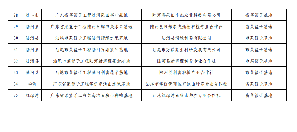 关于公布2021年度汕尾市“菜篮子”基地和“融湾菜篮子”基地名单的函