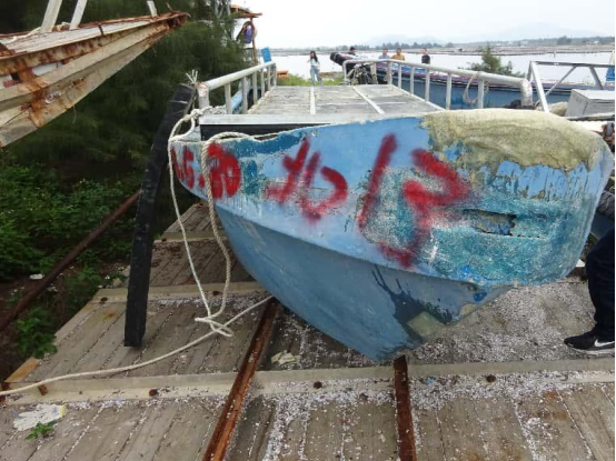 2025年6月9日,汕尾市海洋综合执法支队在汕尾城区牛角村(22.719997°N、115.347787°E附近海域)查获一艘涉嫌“三无”船舶,船上刷写标识“06014”,船体材质玻璃钢,总长约7米,型宽约2.2米,主机1部。