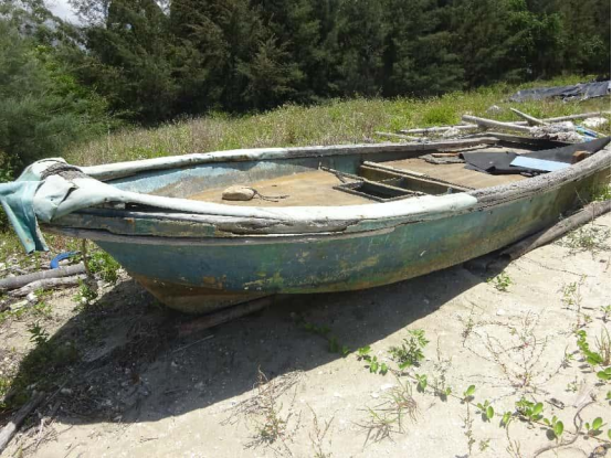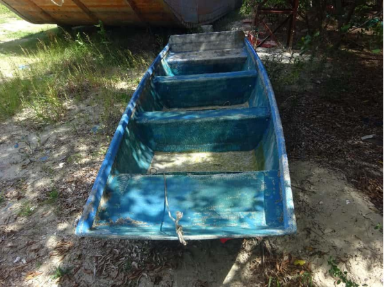 12.编号“扣13”船艇,船体材质:玻璃钢,总长6.05米,型宽:2.1米,主机1部,未见主机铭牌,主机型号不详,主机功率不详;