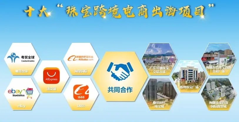 十大“珠宝跨境电商出海项目”合作双方:粤贸全球、阿里国际、1688、速卖通、eBay、广东可塘珠宝交易市场、御景时代珠宝城、荔塆珠宝广场、梅陇珠宝首饰国际商贸城、梅陇东怡珠宝首饰交易广场。