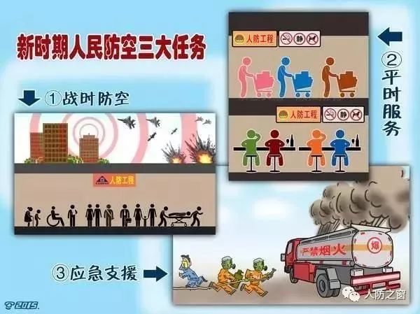 “战时防空、平时服务、应急支援”,是新时代人民防空的三大任务。防范和减轻空袭危害、保护国家和人民群众生命财产安全,是人民防空的根本使命。