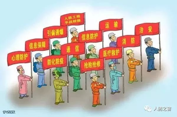 平时,人防部门按照“专业对口、专群结合”的原则,组建各种类型的群众防空组织,即“人防专业队伍”。