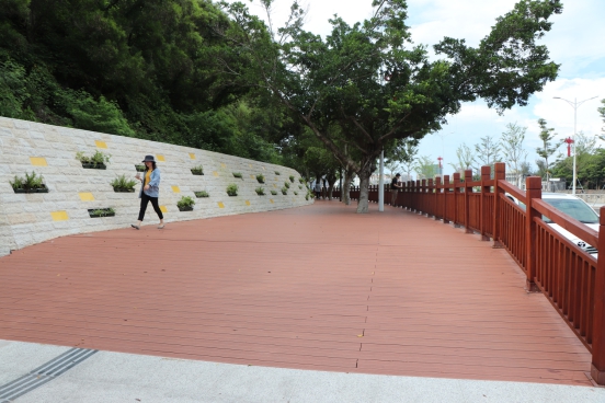 这条新建的人行栈道全长约255米,将城区海滨大道非机动车道和人行道分隔,大大提升了市民出行的安全系数。该路段原慢行路相对狭窄,平时非机动车辆和行人都在这一条路上,较为拥挤且不安全。同时,人行道上有大量榕树,其根系破坏原有地面铺装,影响行人通行;加上挡土墙藤本覆盖,杂草丛生,景观效果差;墙下排水沟年久失修,占用人行空间且缺乏盖板,存在安全隐患。此次提升人行道高度,设置木栈道主要是为了将机动车和人行道路进行分离,保证行人安全,同时人行道高度适当抬高,还可远眺对面海景,做到安全与美景“两不误”。为了保留榕树作为汕尾城市发展的记忆,并避免对树木的影响,施工人员选择铺设木栈道,在施工中坚持不破坏任何一棵树木,每碰到树木,都会专门抠出一个区域供树木正常生长。项目人员还对原有的景观榕树进行了保护,使其根系在栈道下生长,对行人以及后续道路管养都大有好处。海滨大道还将布置一些照明的射树灯,景观灯;改造完成之后,市城区这条高颜值的道路将再升格一级,原生态的木栈道将与浩瀚的周边风景融为一体,构成凤山妈祖景区的一道靓丽风景。