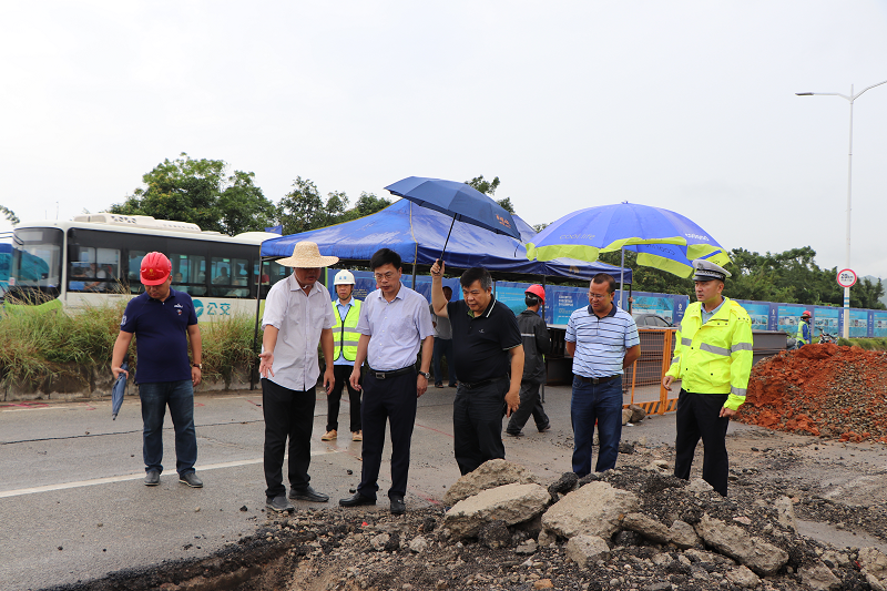8月25日,林少文副市长、王晓东副秘书长到海汕路梧围路段陶河排洪渠沉陷抢修现场指导工作。
