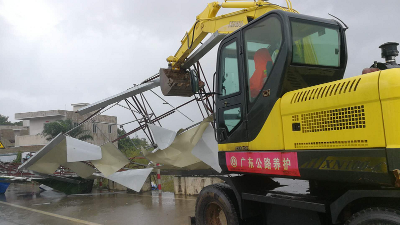 市区公路养护中心防御小组调用大型机械清除倒塌广告牌