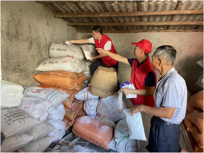党建引领+送保障。党员志愿队来到种粮农户较多的赤坑镇社美村,在村委宣传栏张贴12325全国粮食流通监管热线海报,强化群众对“12325”热线的认知,引导广大群众发挥监督作用并积极举报涉粮违法违规行为,保障种粮农户利益。在社美村走家串户开展宣传工作,仓储保管技术人员发现种粮农户家中储粮出现生虫情况,及时采取惰性粉杀虫措施进行处理,并向村内种粮农户赠送一批惰性粉杀虫剂,指导农户在储粮过程中如何加强害虫预防,从而提高村民节约粮食、科学保粮、减损增收。