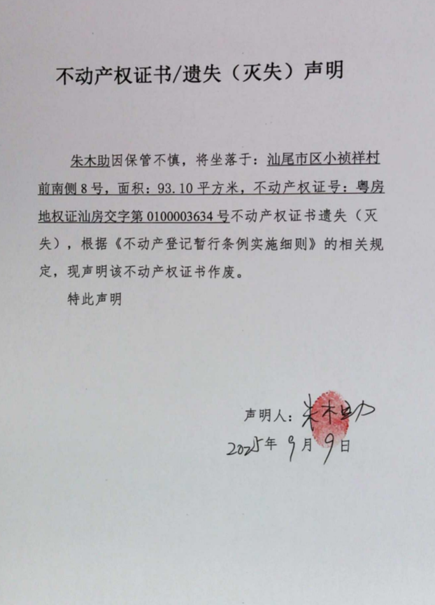 不动产权证书遗失(灭失)声明(朱木助)