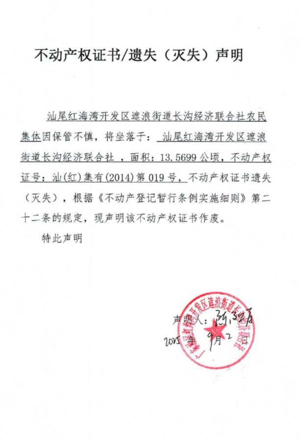 不动产权证书遗失(灭失)声明(长沟经济联合社农民集体)