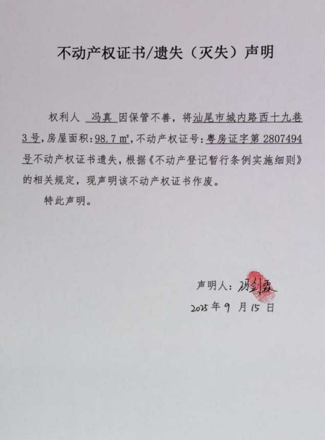 不动产权证书遗失(灭失)声明(冯真)