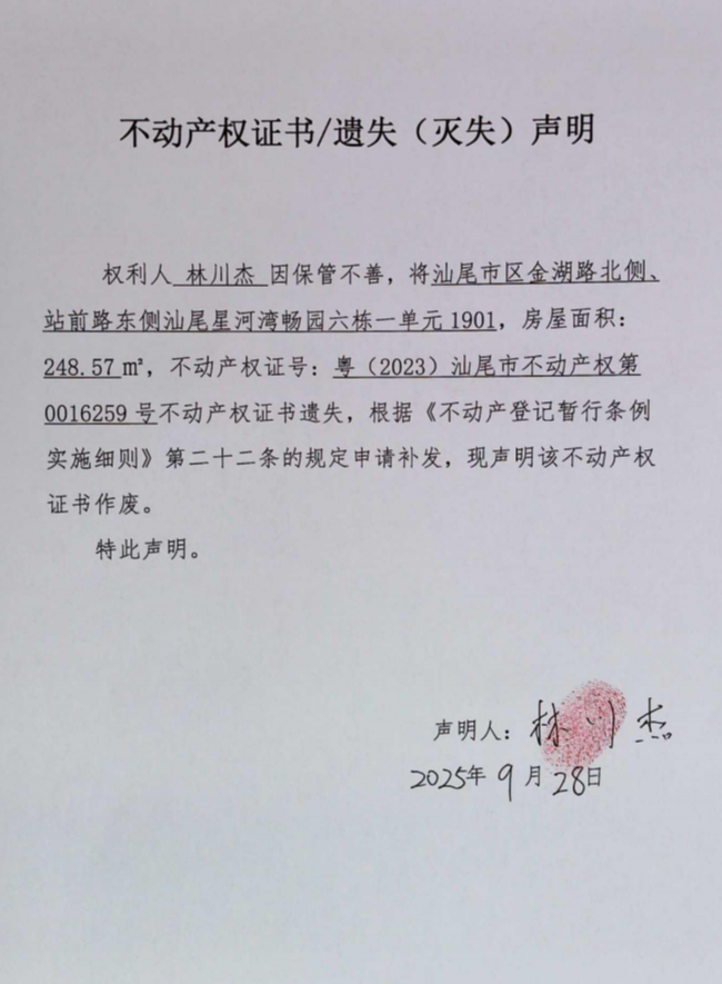 不动产权证书遗失(灭失)声明(林川杰)
