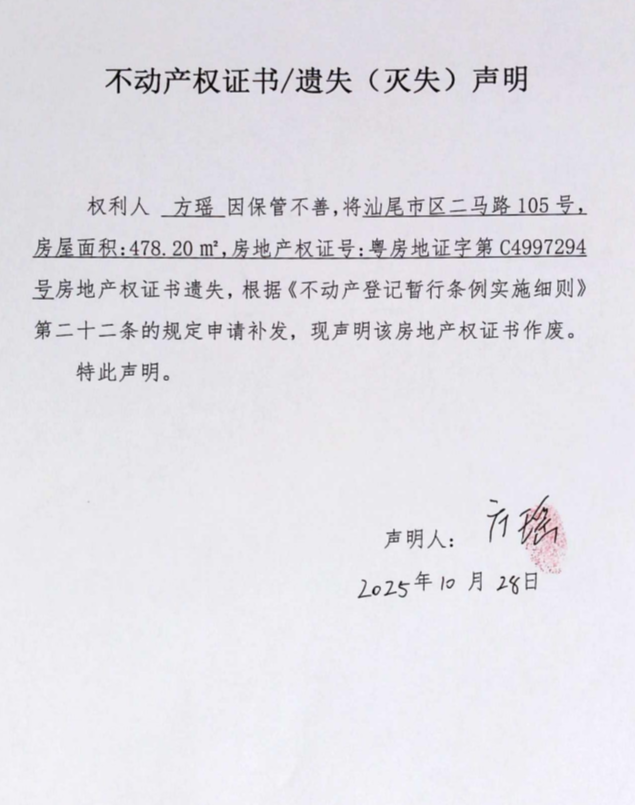 不动产权证书遗失(灭失)声明(方瑶)
