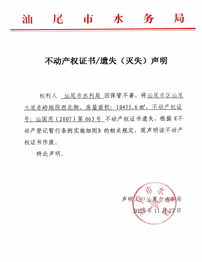 不动产权证书遗失(灭失)声明(汕尾市水利局)