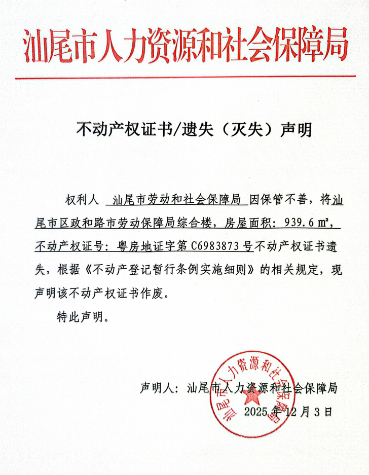 不动产权证书遗失(灭失)声明(汕尾市劳动和社会保障局)