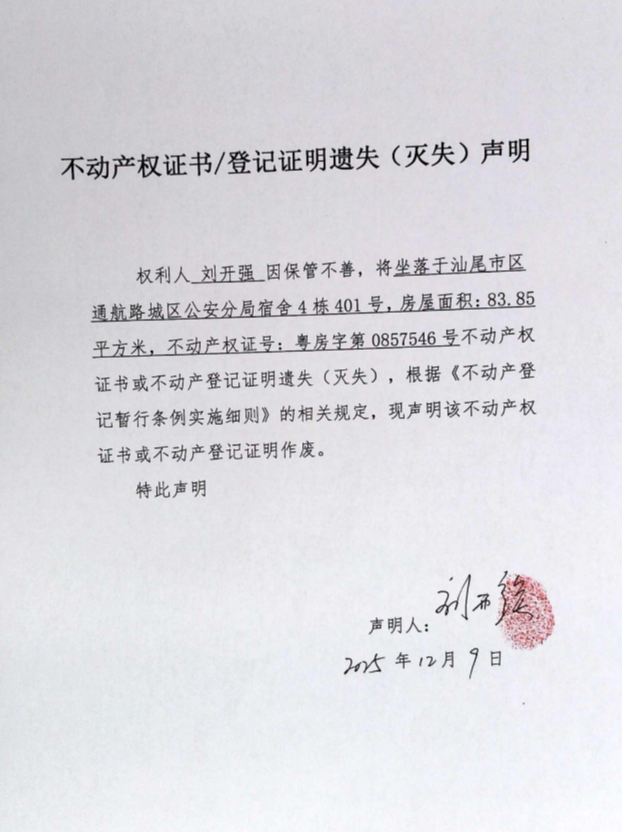 不动产权证书遗失(灭失)声明(刘开强)