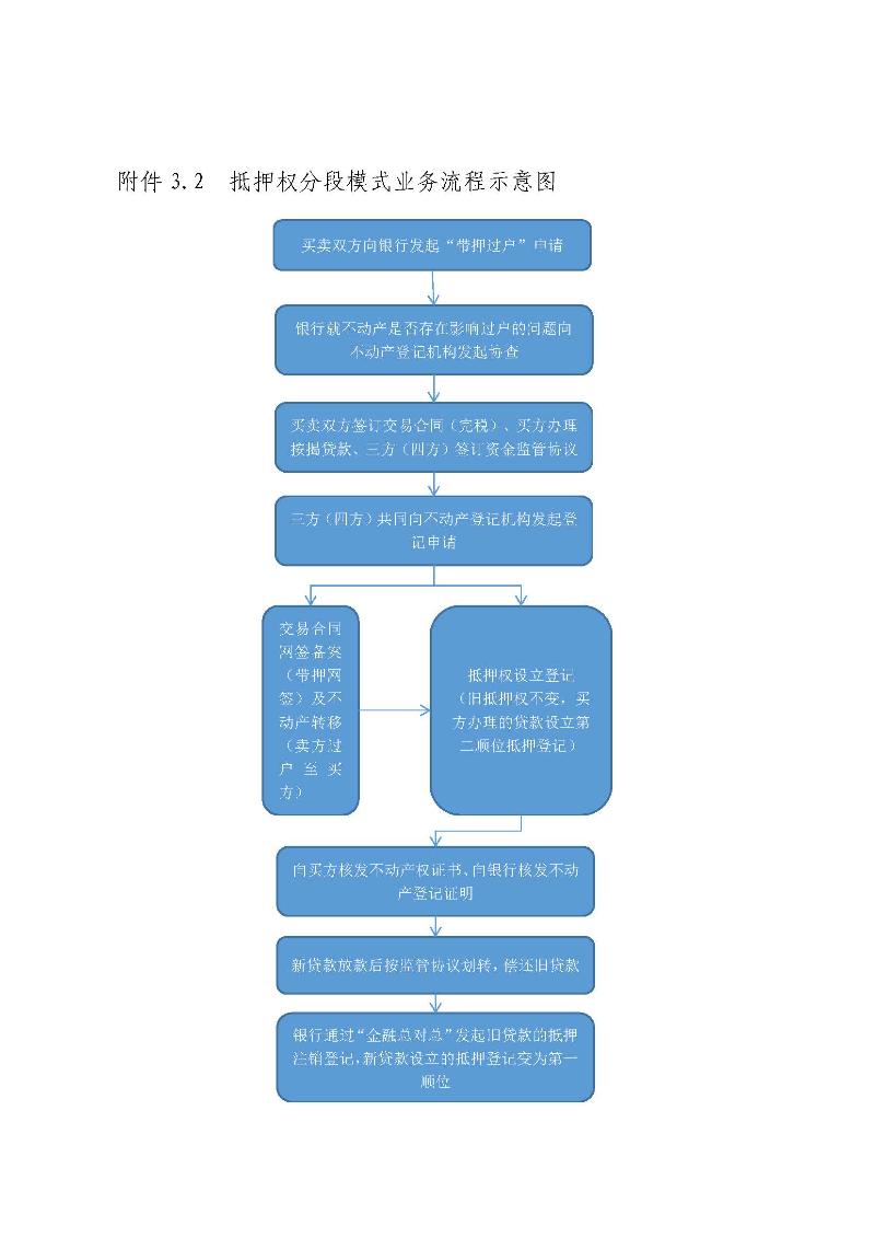 3.抵押权分段模式:通过借新贷、过户后(旧抵押权不变)并还旧贷实现“带押过户”的,不动产登记机构根据申请按序将交易合同网签备案及不动产转移(卖方过户至买方)、抵押权设立(买方新办理的按揭贷款设立第二顺位抵押权)合并办理。