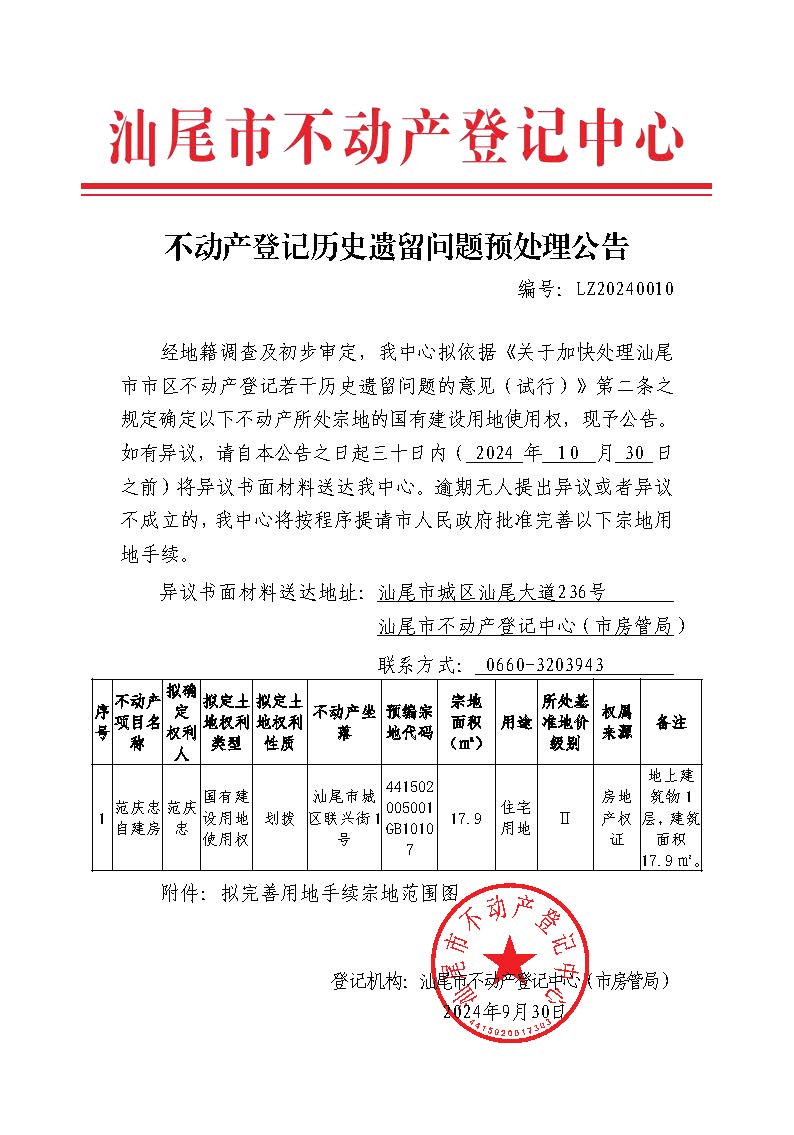 不动产登记历史遗留问题预处理公告(范庆忠)
