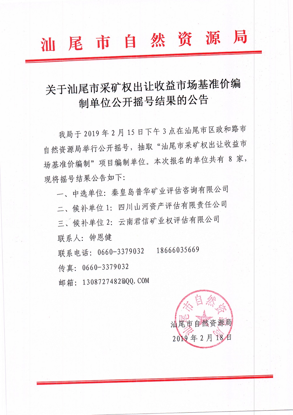 关于汕尾市采矿权出让收益市场基准价编制单位公开摇号结果的公告