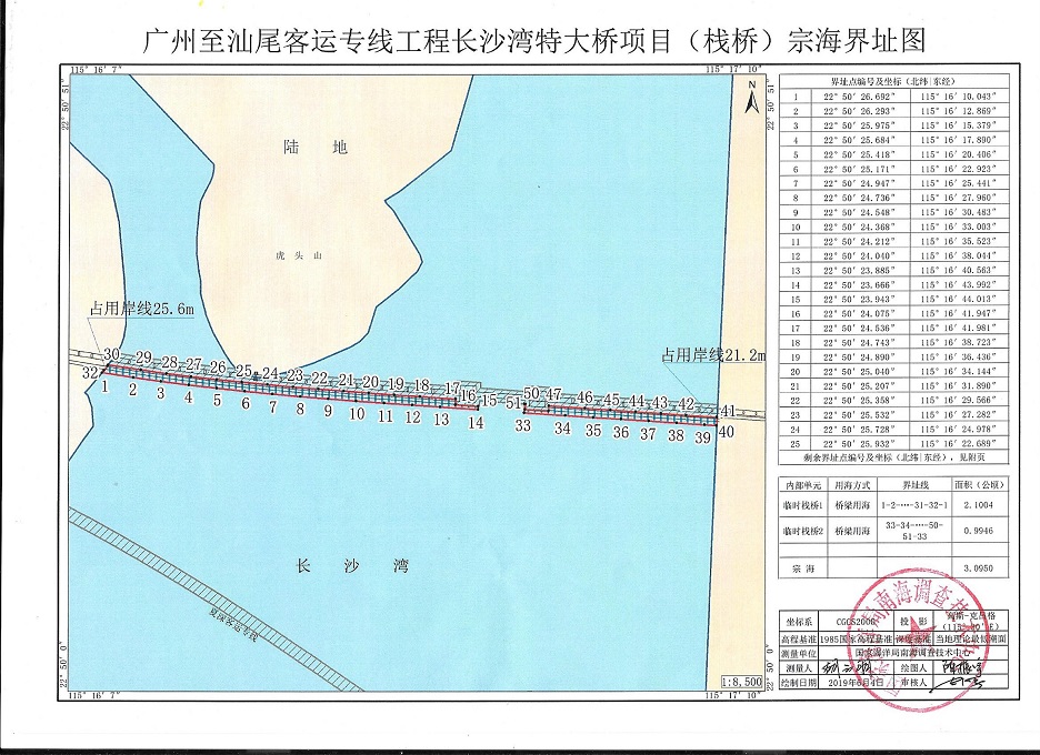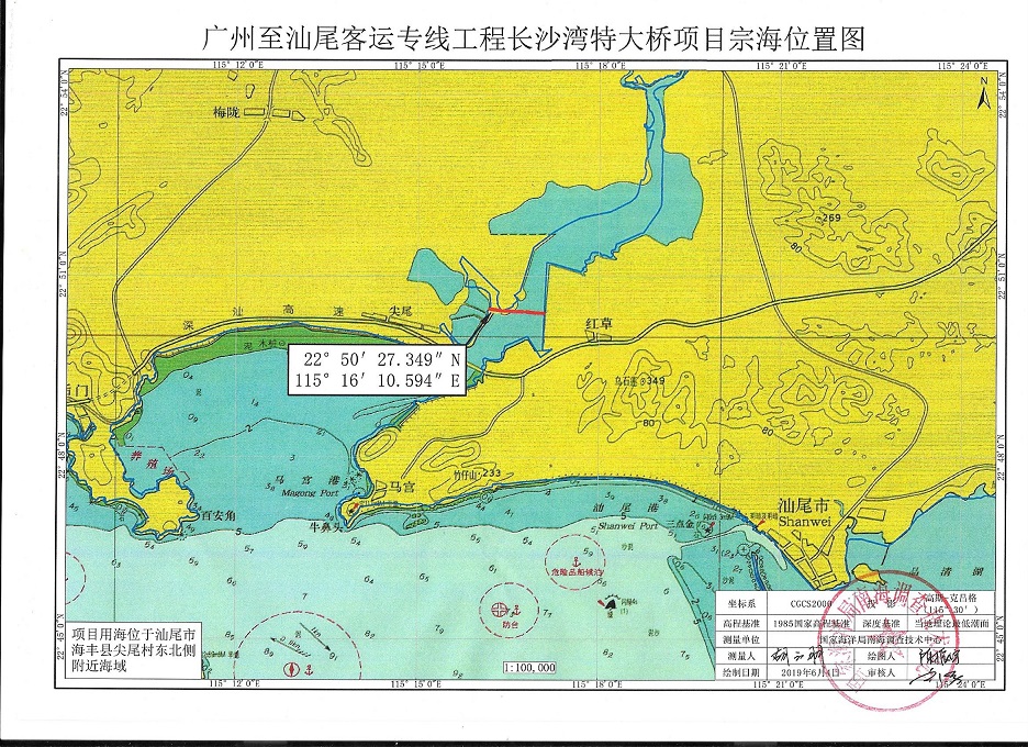 广东广汕铁路有限责任公司拟在市城区红草镇和海丰县梅陇镇之间建设广州至汕尾客运专线长沙湾特大桥项目,项目位于厦深铁路跨海大桥以北约750m,东西向跨越长沙湾海域。项目涉及用海分为大桥主桥和临时施工栈桥,其中大桥主桥申请用海面积5.3155hm2,大桥跨海段长度1564.61m,主桥占用人工岸线193米,主桥用海年限40年;临时施工栈桥申请用海面积3.0950hm2,用海年限3年。用海性质为公益性,用海类型为交通运输用海中的路桥用海,用海方式为构筑物中的跨海桥梁用海(具体范围见附图)。有关事宜公示如下: