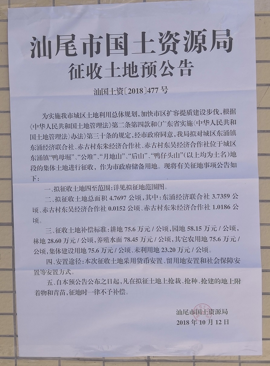 汕尾市国土资源局征收土地预公告[汕国土资〔2018〕477号]