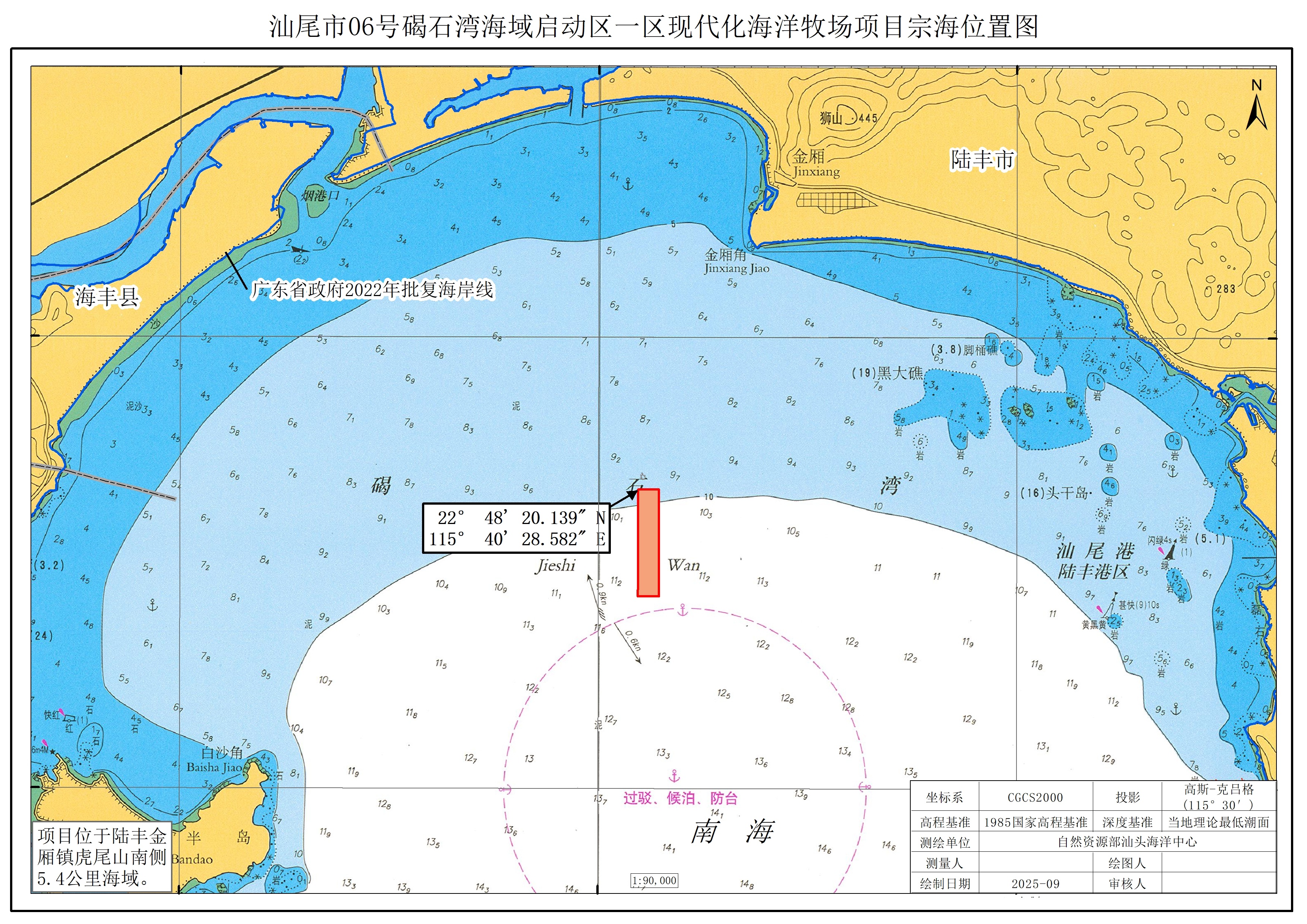 一、汕尾市06号碣石湾海域启动区一区现代化海洋牧场项目位于碣石湾陆丰市金厢镇虎尾山南侧约5.4公里海域处。项目申请用海总面积为102.0097公顷,其中透水构筑物用海(大型围栏养殖平台)3.6385公顷、开放式养殖用海(网箱养殖)98.3712公顷,项目申请用海期限为15年,不占用岸线。