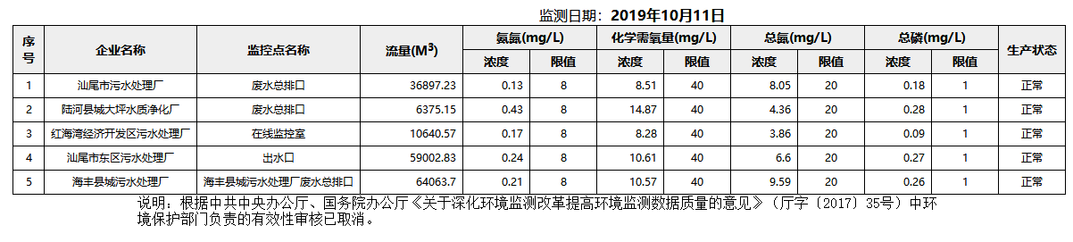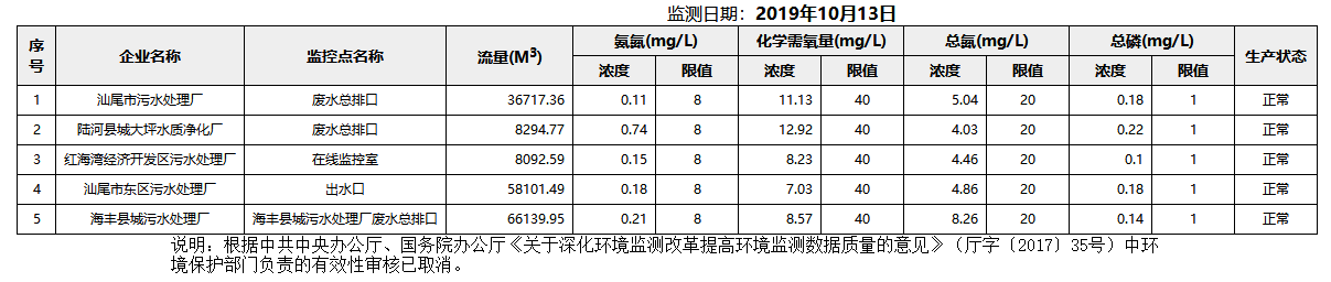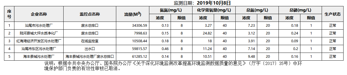 2019年10月8-13日汕尾市国控重点污染源废水企业自动监控数据报表