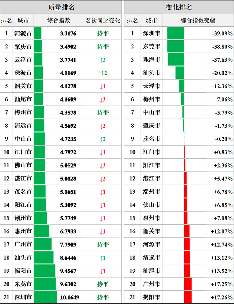 按照地表水省考断面综合指数排名,1-6月,前三位为河源、肇庆、云浮市,后三位为深圳、东莞、揭阳市。与去年同期相比,深圳、东莞、珠海等9市有所改善,揭阳、广州、汕尾等12市有所变差。