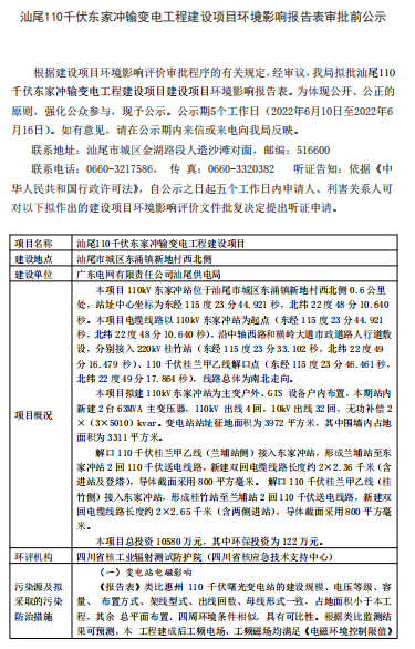 汕尾110千伏东家冲输变电工程建设项目环境影响报告表审批前公示