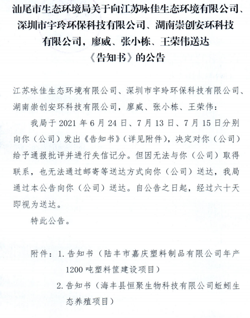 汕尾市生态环境局关于向江苏咏佳生态环境有限公司、深圳市宇玲环保科技有限公司、湖南崇创安环科技有限公司,廖威、张小栋、王荣伟送达《告知书》的公告